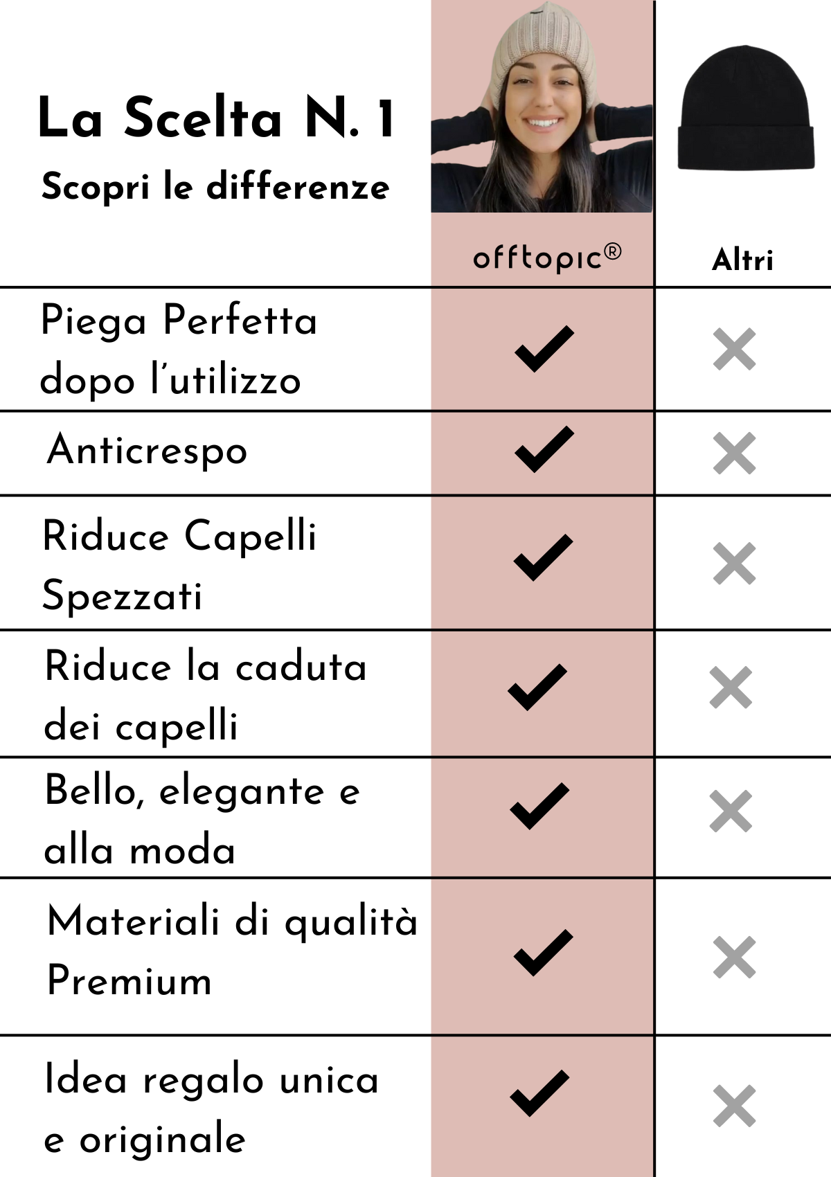 Offtopic® utilizza solo materiali pregiati per risultati incredibili. Il cashmere assicura il caldo, la seta 100% pura garantisce capelli belli e sani. Impossibile trovare di meglio!