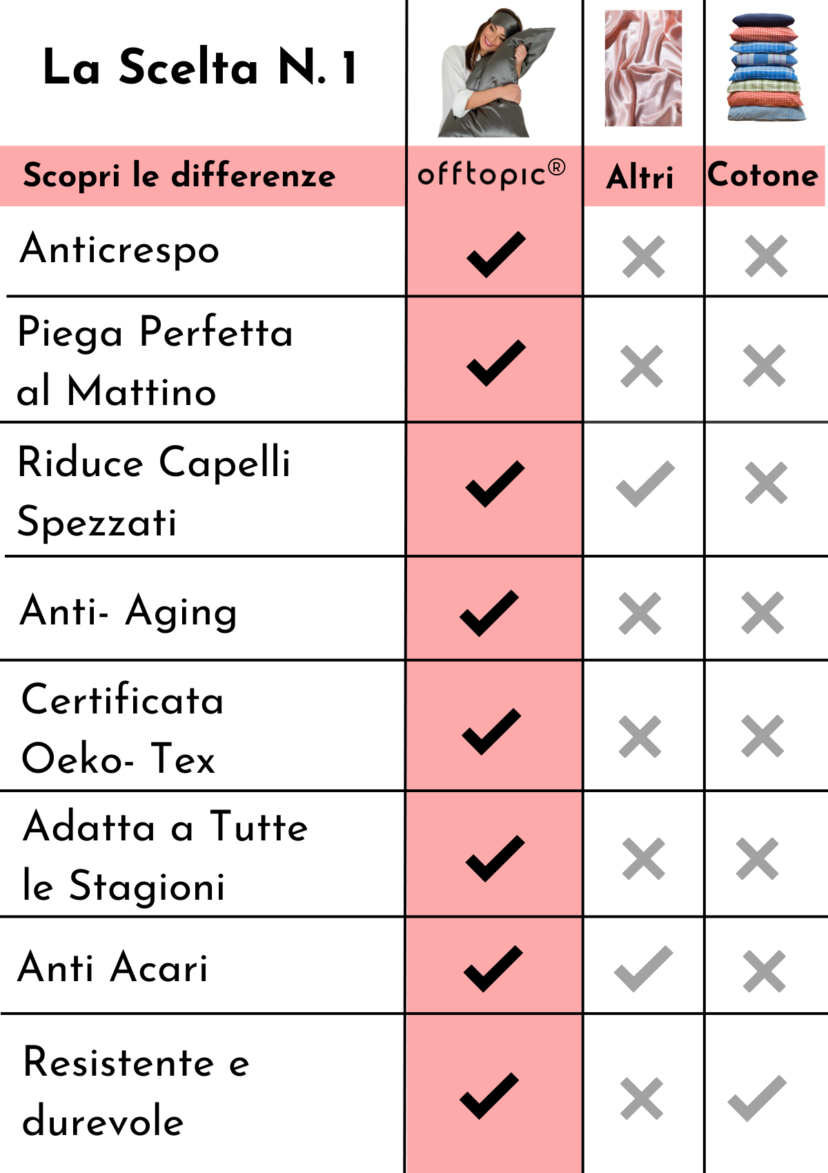 Il raso è solo un tipo di trama, la seta è invece una fibra 100% naturale! Con il termine raso non si identifica la composizione del tessuto ma solamente il tipo di trama che rende qualsiasi tessuto liscio. Solitamente, quando leggi "federa in raso", viene utilizzato il poliestere come fibra (quindi plastica) e non la seta. Dormiresti su una tessuto realizzato con la plastica ma liscio e lucido😱 Diffida sempre di prodotti low cost e assicurati che la composizione sia 100% seta!
